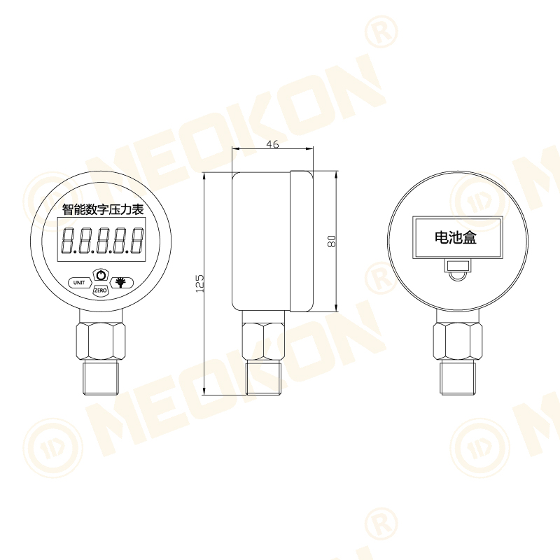 直徑80mm,0.4級(jí) 0.2級(jí)可選,304不銹鋼外殼及接頭。 2節(jié)AAA電池供電,續(xù)航8-12個(gè)月,具有峰值記錄、單位切換、背光、開(kāi)關(guān)機(jī)等功能。