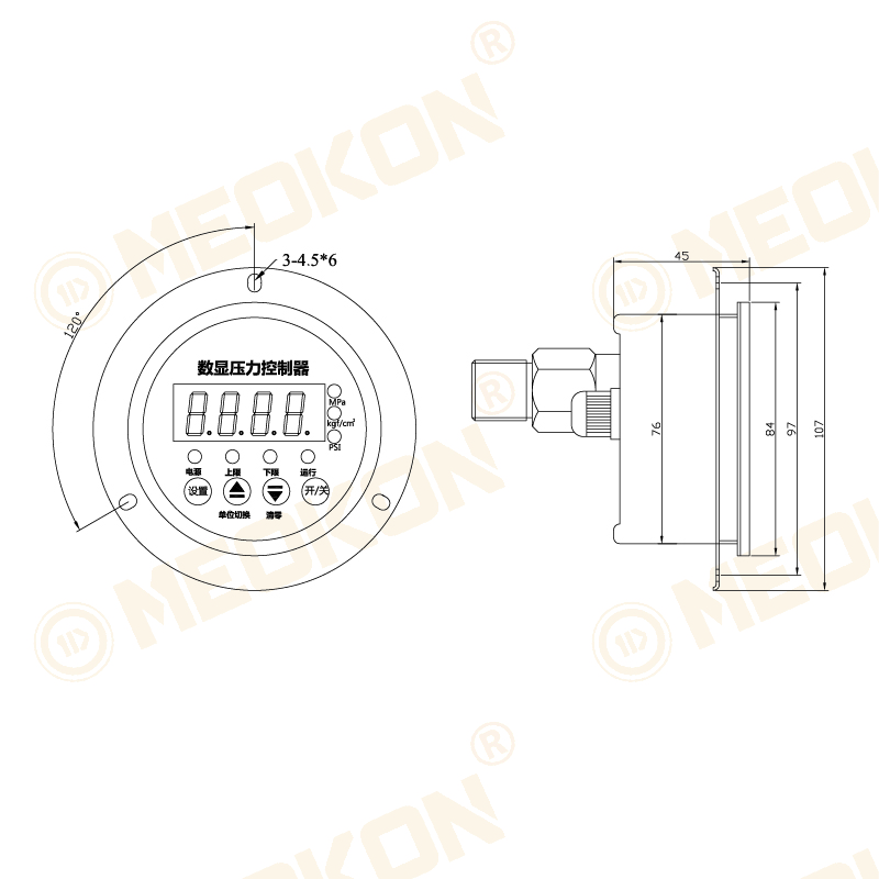 主要特點:75mm軸向安裝 304不銹鋼表殼 304不銹鋼接頭 防水對插出線MD-S系列數顯壓力控制器