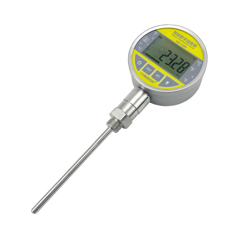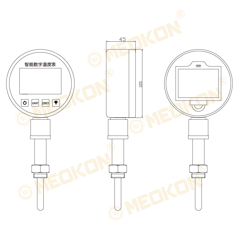 100mm超大表盤,55x55mm超大液晶5位顯示,溫度精度高,低電報警、單位切換等多種輔助功能,探頭長度及螺紋,溫度量程可定制